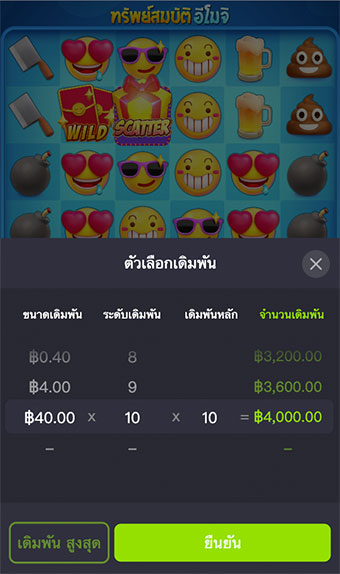 จำนวนเงินในการวางเดิมพัน ในสล็อต Emoji Riches ผู้เล่นสามารถกำหนดจำนวนเงินในการวางเดิมพันได้อย่างอิสระ โดยสามารถวางเดิมพันต่ำสุดได้ตั้งแต่ 4 บาทต่อรอบ และสามารถวางเดิมพันสูงสุดได้ที่ 4,000 บาทต่อรอบเลยทีเดียว ซึ่งในการเลือกจำนวนเงินในการวางเดิมพัน ยิ่งเลือกจำนวนเงินในการวางเดิมพันที่สูง ขนาดการวางเดิมพันและระดับการวางเดิมพันจะสูงไปด้วย และมันยังทำไห้ได้รับเงินรางวัลสูงตามไปด้วยเช่นเดียวกัน