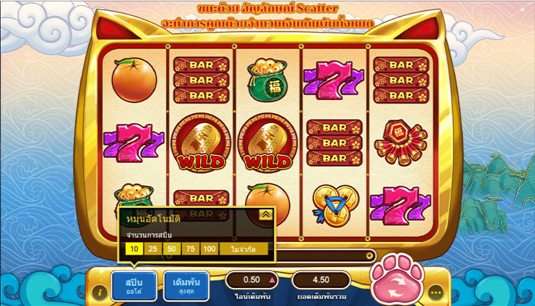 เมื่อเลือกแล้วตัวเกมจะกำหนดเรทราคาในการเล่นขึ้นมา โดยจากภาพตัวอย่างเราจะเลือกไลน์เดิมพัน 0.50 บาท นั้นคือเรทราคาในการเดิมพันต่ำสุด เมื่อคูณรูปแบบการชนะ 9 ไลน์ ก็จะเป็นจำนวนเงิน 4.5 บาท นั้นเอง