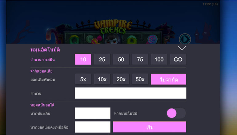 นี้ก็คือภาพตัวอย่างการตั้งค่าการเล่นในรูปแบบอัตโนมัติ จะเห็นว่าผู้เล่นสามารถกำหนดเองได้ตั้งแต่จำนวนเงิน จำนวนรอบ รวมถึงสามารถตั้งยอดเงินคงเหลือได้อีกด้วย ซึ่งมันจะช่วยไห้ผู้เล่นนั้นสะดวกในการเล่นเพิ่มขึ้นอย่างมาก เพราะผู้เล่นจพสามารถเล่นได้โดยที่ไม่จำเป็นต้องเฝ้าจอนั้นเอง